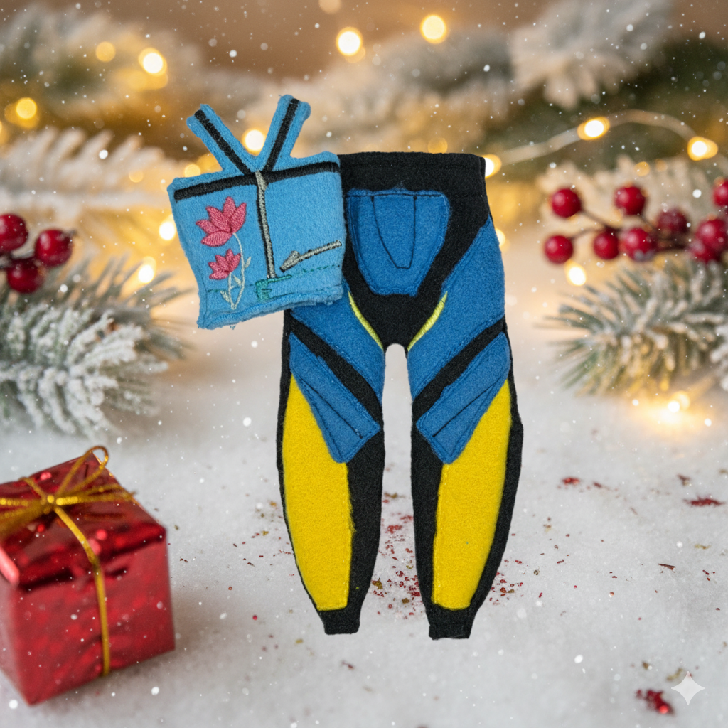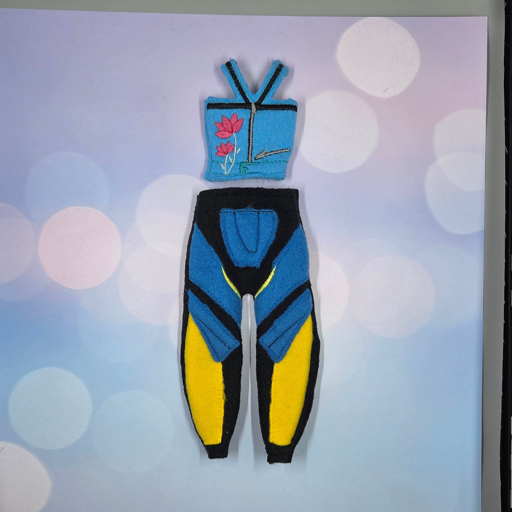 This two-piece set includes a blue strappy top embroidered with a pink flower and zip detail, paired with sleek black, blue, and yellow pants — inspired by stage-ready performance looks that absolutely slay. Perfect for the elf who’s ready to drop their next hit or headline the North Pole talent show! 🌟